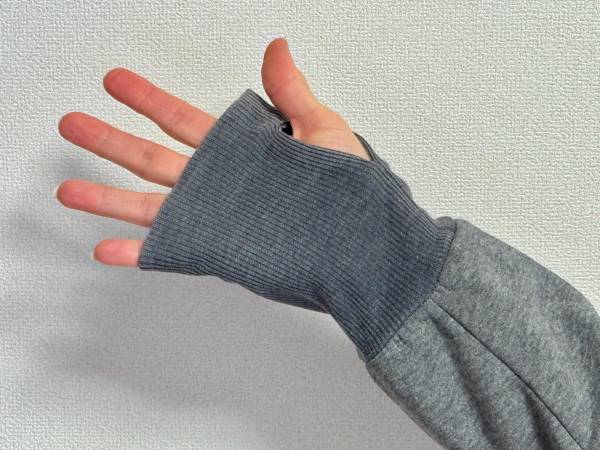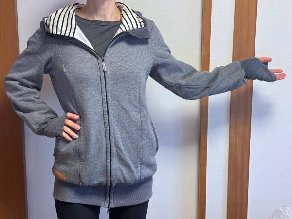The first version is to use the hoodie as is. The official size is S but I would say it's closer to M. The grey color fits well with all kinds of trousers and skirts and the striped accents bring a touch of playfulness. The sleeves are long and there are holes for thumbs.