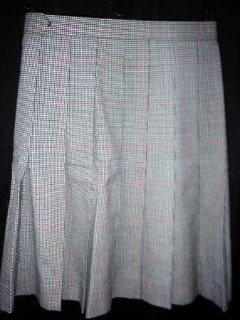 Two plaid pleated skirts, 70% polyester and 30% wool.