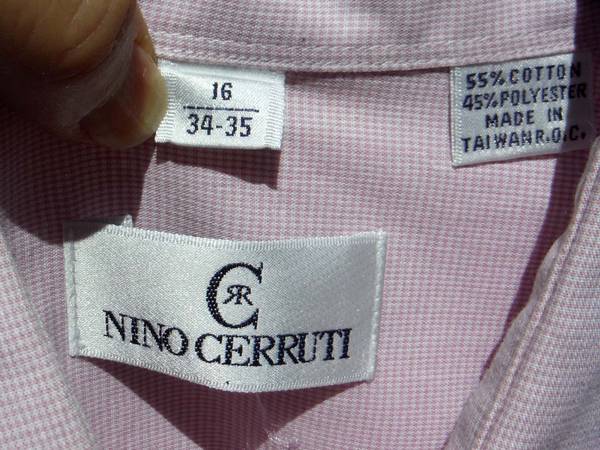1. Pink Nino Cerutti shirt is ¥1000. This is a 55% polyester shirt like new, with an Italian designer name, but was purchased off the shelf.