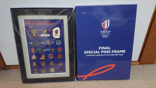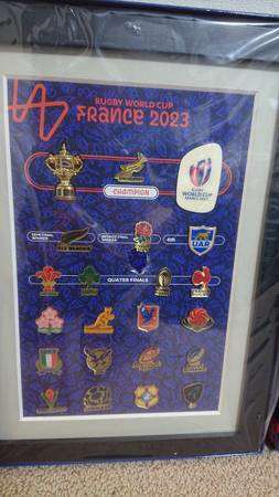 2023 France Rugby World Cup framed pins of all teams and top 8 finishing positions. Great for a South African Rugby fan. 26cms wide, 36cm high. Still wrapped in plastic and never opened.