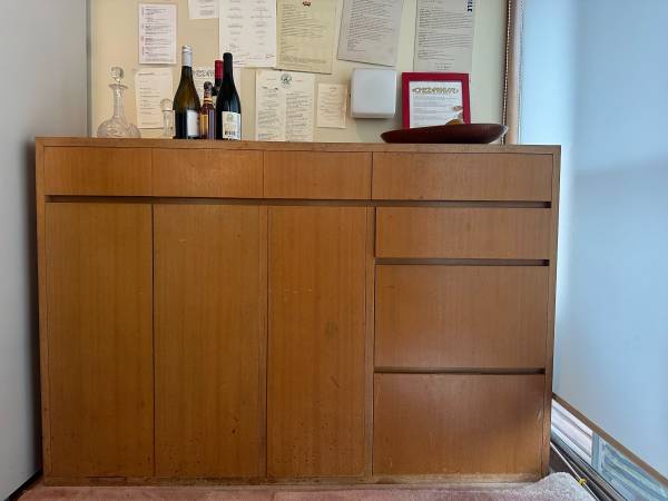 We are selling a custom-made shelf and drawer storage unit. We placed it next to our kitchen to provide more space. Size: Length 148cm, Width 40 cm, Height 100cm