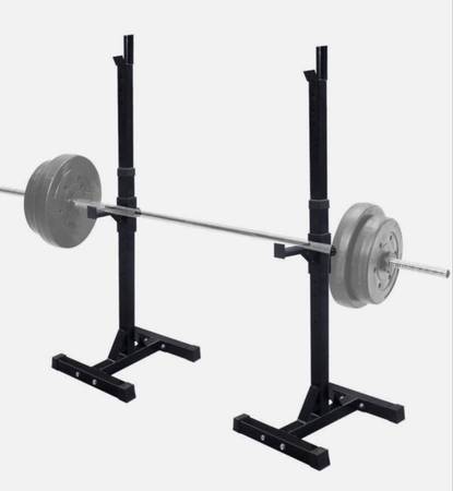 Squat rack with barbell and two 15kg plates. The rack made up of two free-standing stances and easy to move. Can also be used for dips and additional weights can be purchased on Amazon.