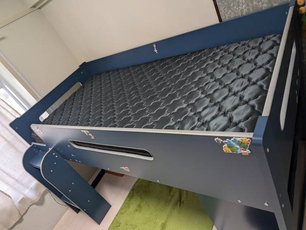 Bed, desk, drawers for clothes or toys. Excellent condition. Used only 1 year and half . Includes Matress clean and in great condition. This Bed system is popular for Kids in elementary school....