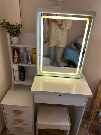 Vanity with stool and light up mirror with three settings. Plenty of storage for makeup and skincare products, mirror slides to reveal more shelves. Stool suitable for up to 173 cm person to sit at....