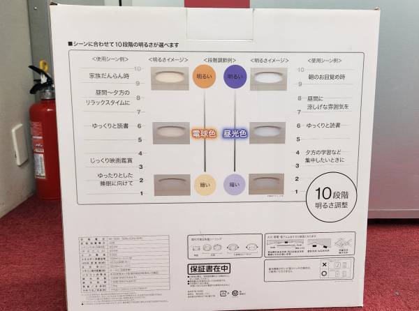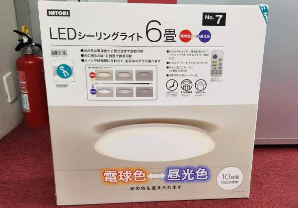 This is a Nitori LED ceiling light recommended for 6 tatami mat-sized rooms. It can change warmth and brightness at 10 different levels and includes a remote. It was in a room I rarely used for a couple of years and then has just been sitting in storage since then in its original box. Please check all information on the box to be sure it will work for you ☺️. All sales final.