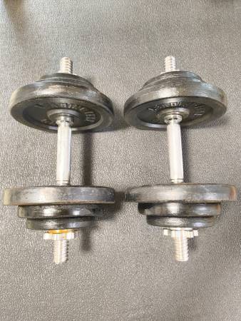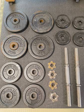 The dumbbells are used, there is some surface rust on some plates and the lock nuts, but overall in good condition.